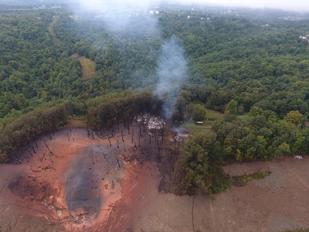 Even those who don’t follow the Revolution story closely will remember vividly the explosion of September 10, 2018, when a section of the Revolution pipeline, in operation only a week, slid down a steep bank in a landslide and ruptured, releasing natural gas which caught fire. The fire consumed a nearby house, from which the residents narrowly escaped. Several acres of trees were burned and towers supporting an overhead high-voltage transmission line collapsed. Debris from the landslide ended up in the creek below.