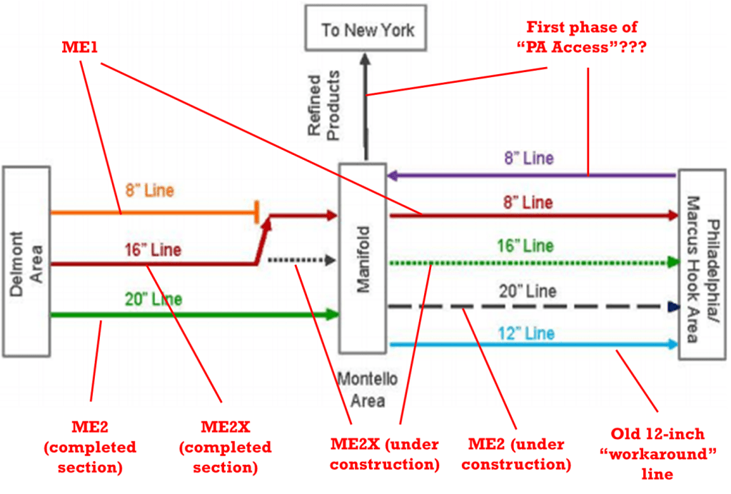 Actual situation: The PA Access Pipeline was billed as a scheme to moved refined products, notably gasoline, back and forth between east coast and midwestern markets, taking advantage of pricing disparities. It was assumed that, with the completion of ME2X, ME1 would no longer be needed for NGL transport and could be converted to refined products.